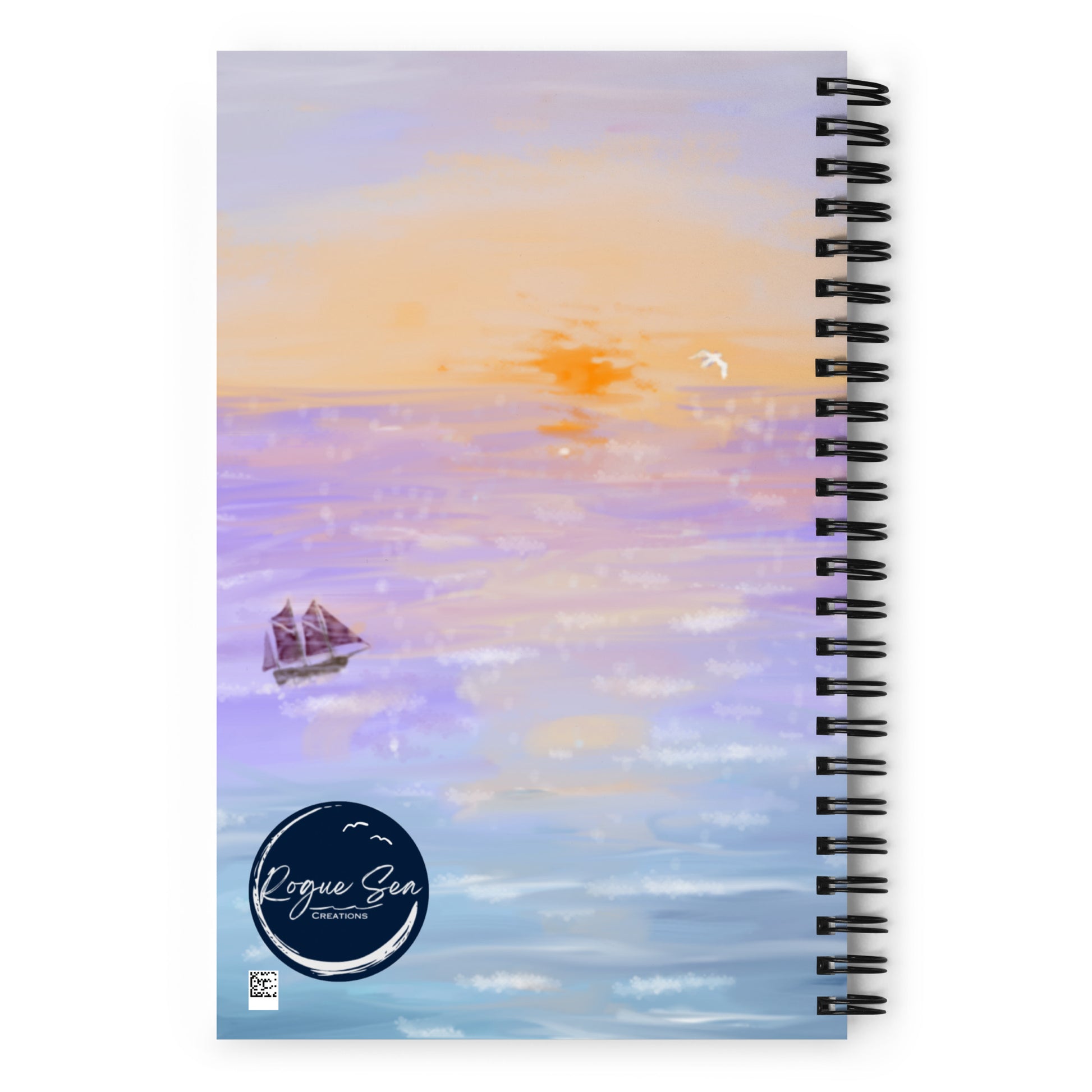 A beautiful notebook with a dream-like painting of a sailing ship in sunset. Finnish design by Rogue Sea Creations.