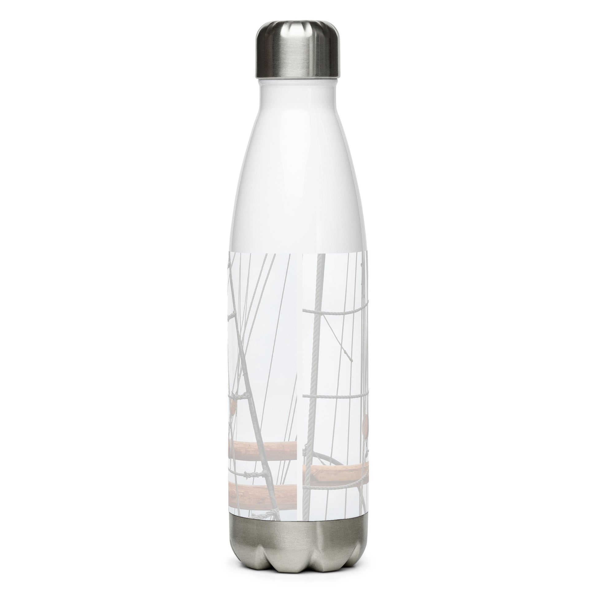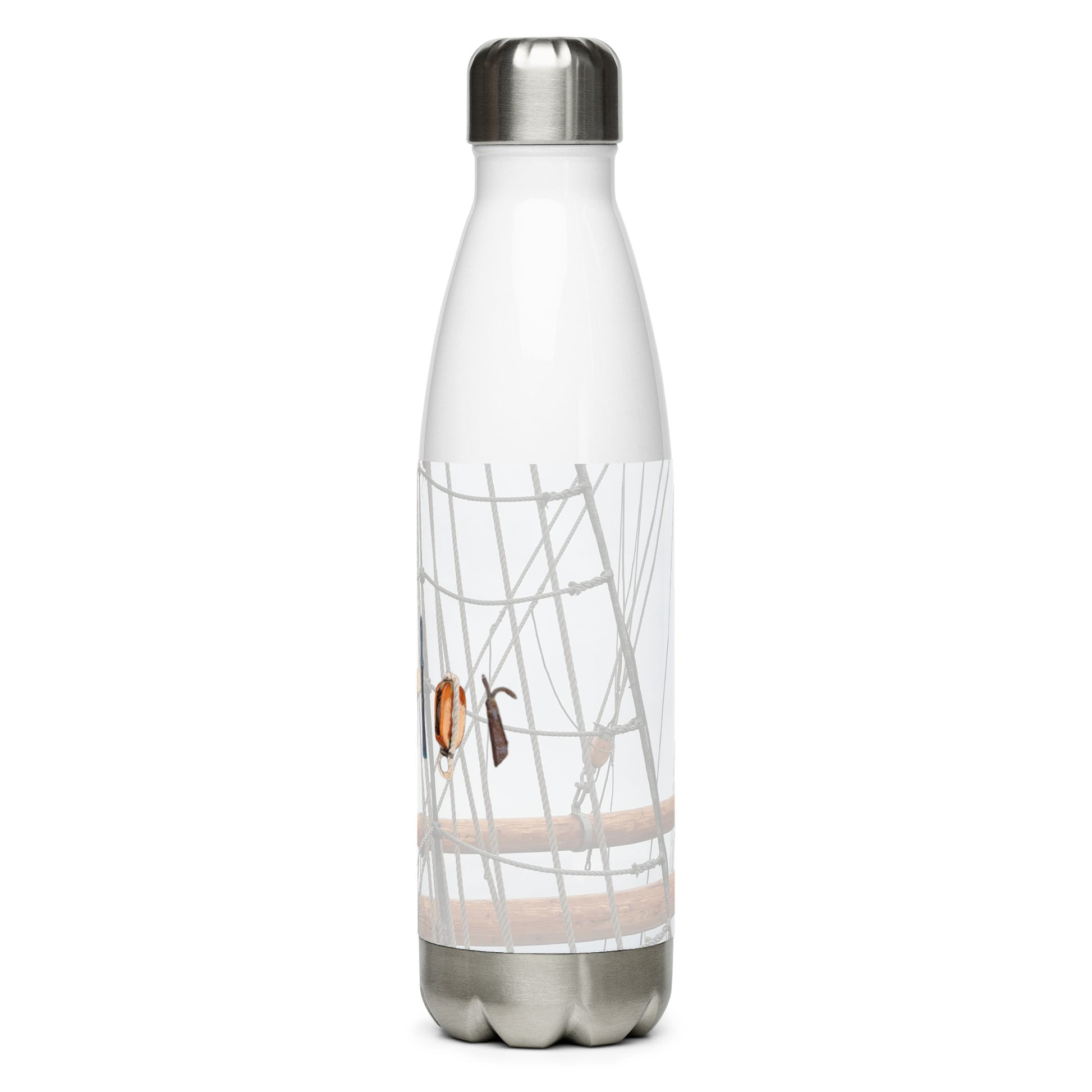 This beautiful stainless steel bottle is full of sea feel and will keep your drink hot or cold for hours. It features a ship's rigging and traditional sailing equipment, such as a marlin spike and a belaying pin. Perfect for a sailor's pre-heated coffee or tea in high seas.