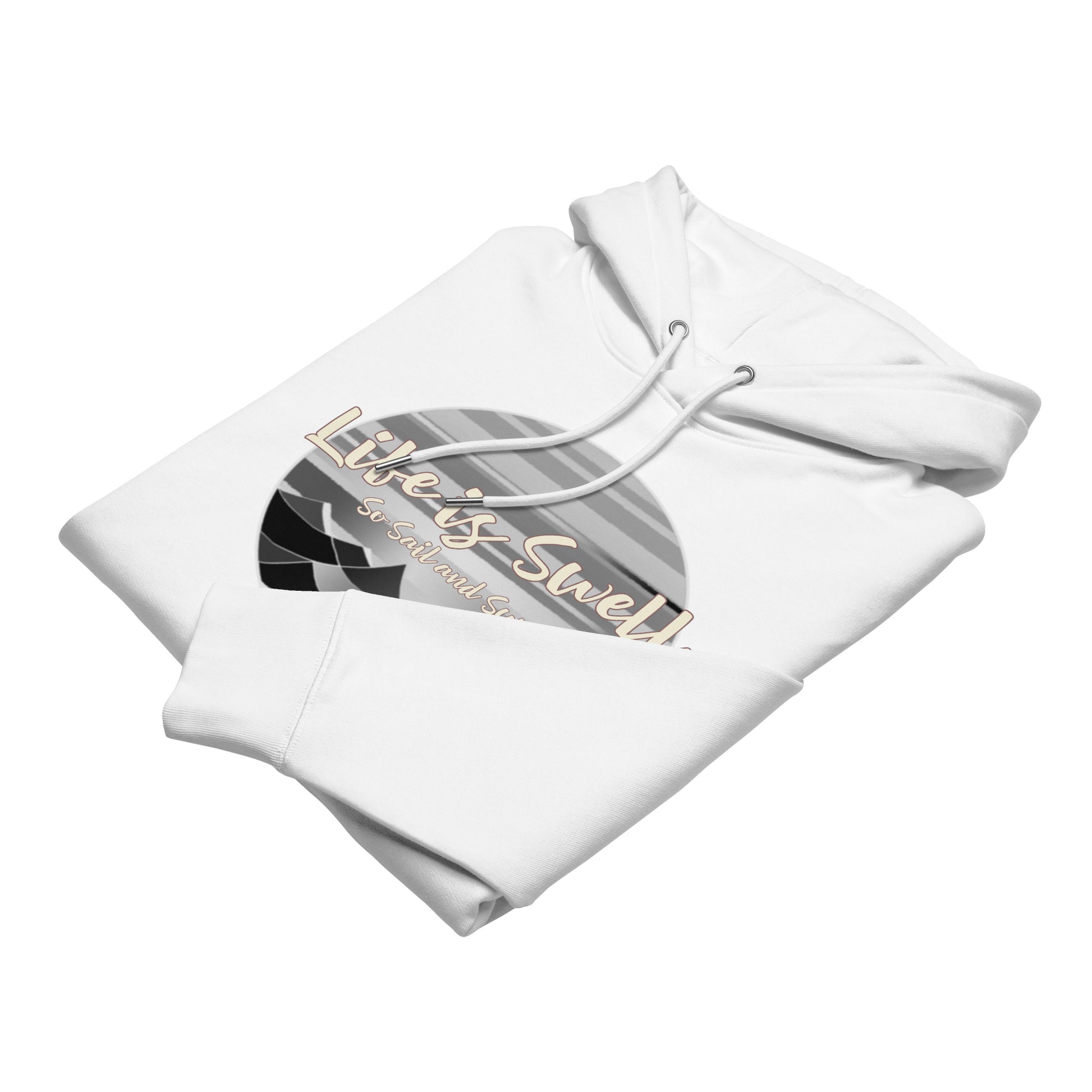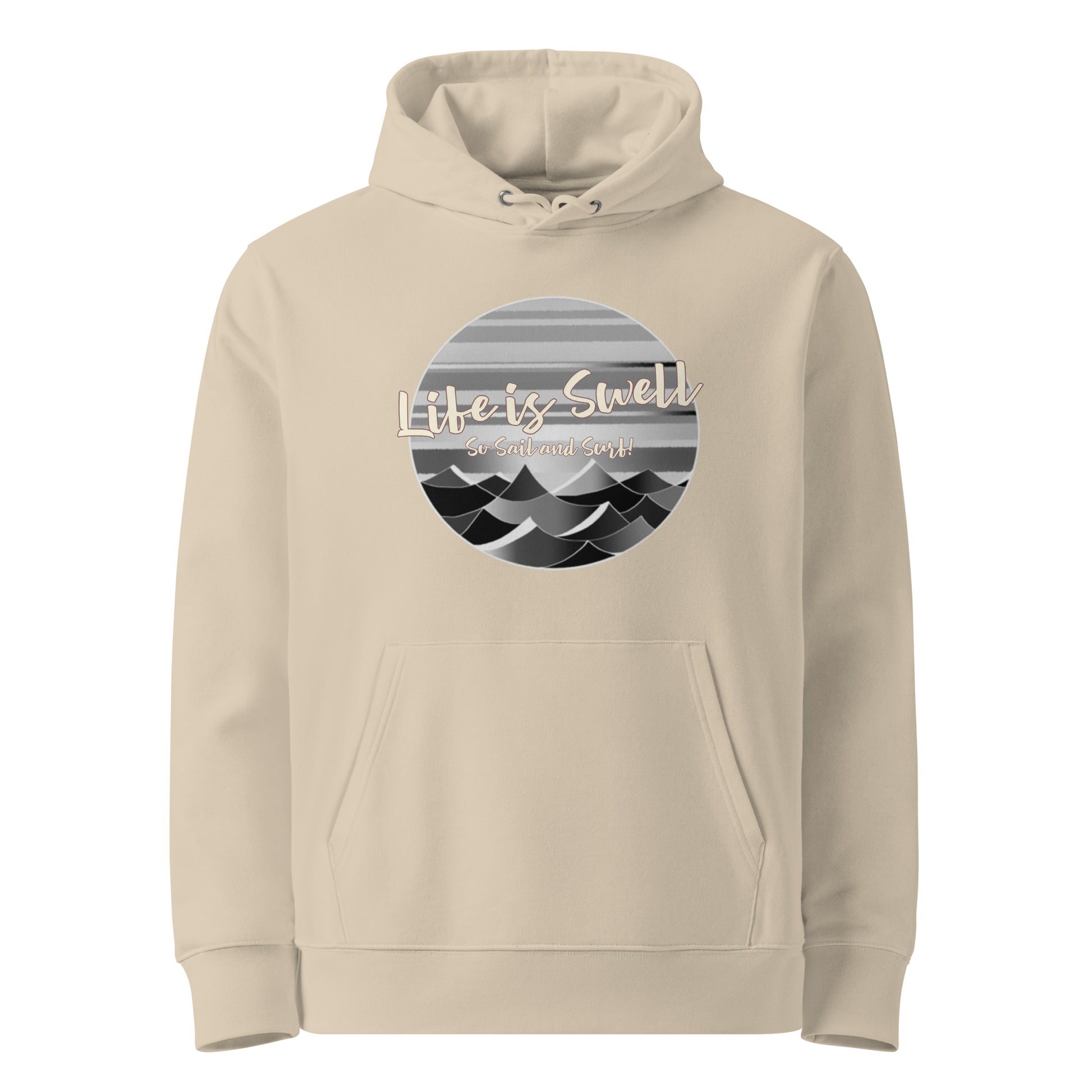 A cool surfer style hoodie with Rogue Sea Creations’ dark Life is Swell wave design. Made from soft and high-quality organic cotton. There’s a double-layered hood and a front pouch pocket to keep you warm on chilly summer evenings or after a swim.